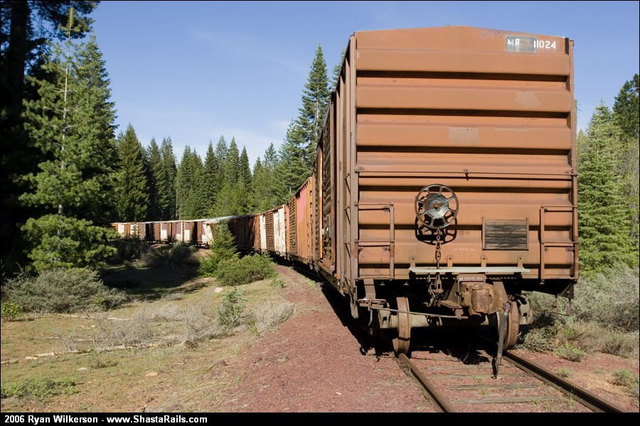 A string of box cars stored on the remnant of the Pondosa branch at Bear Flat