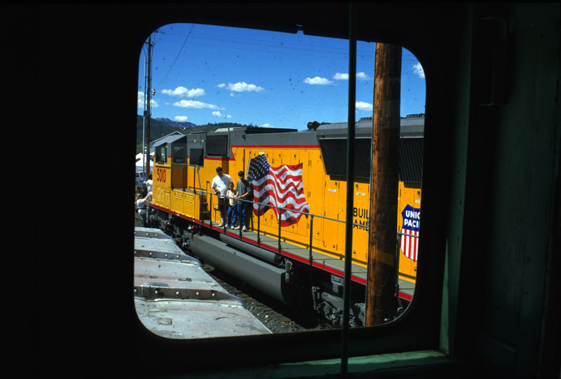A brand new "flagged" SD70M is the higlight of the public tour of new railroad equipment at the Truckee Railroad Days. |